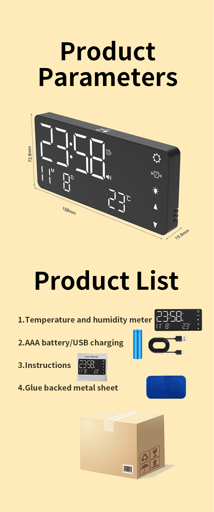 | 3 | Screen display: time/date/week/Temperature ℃ / ℉ |