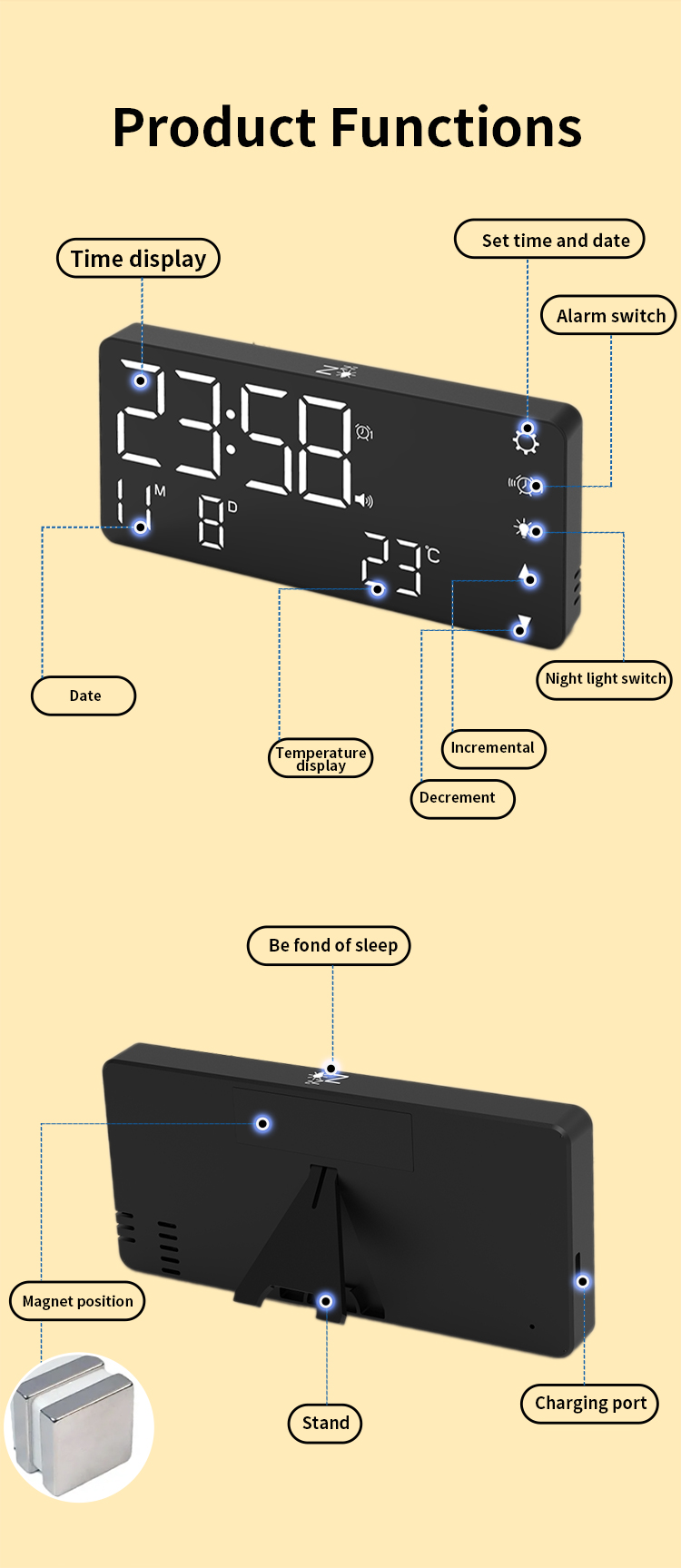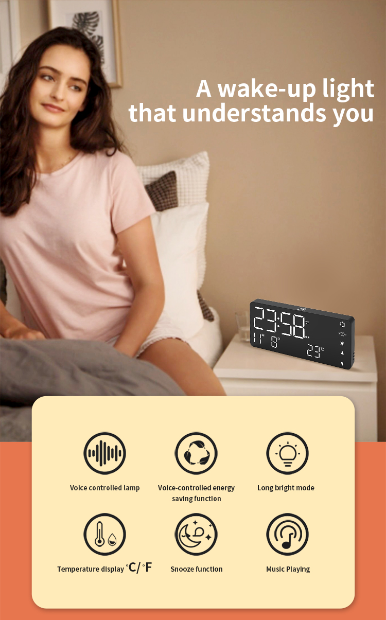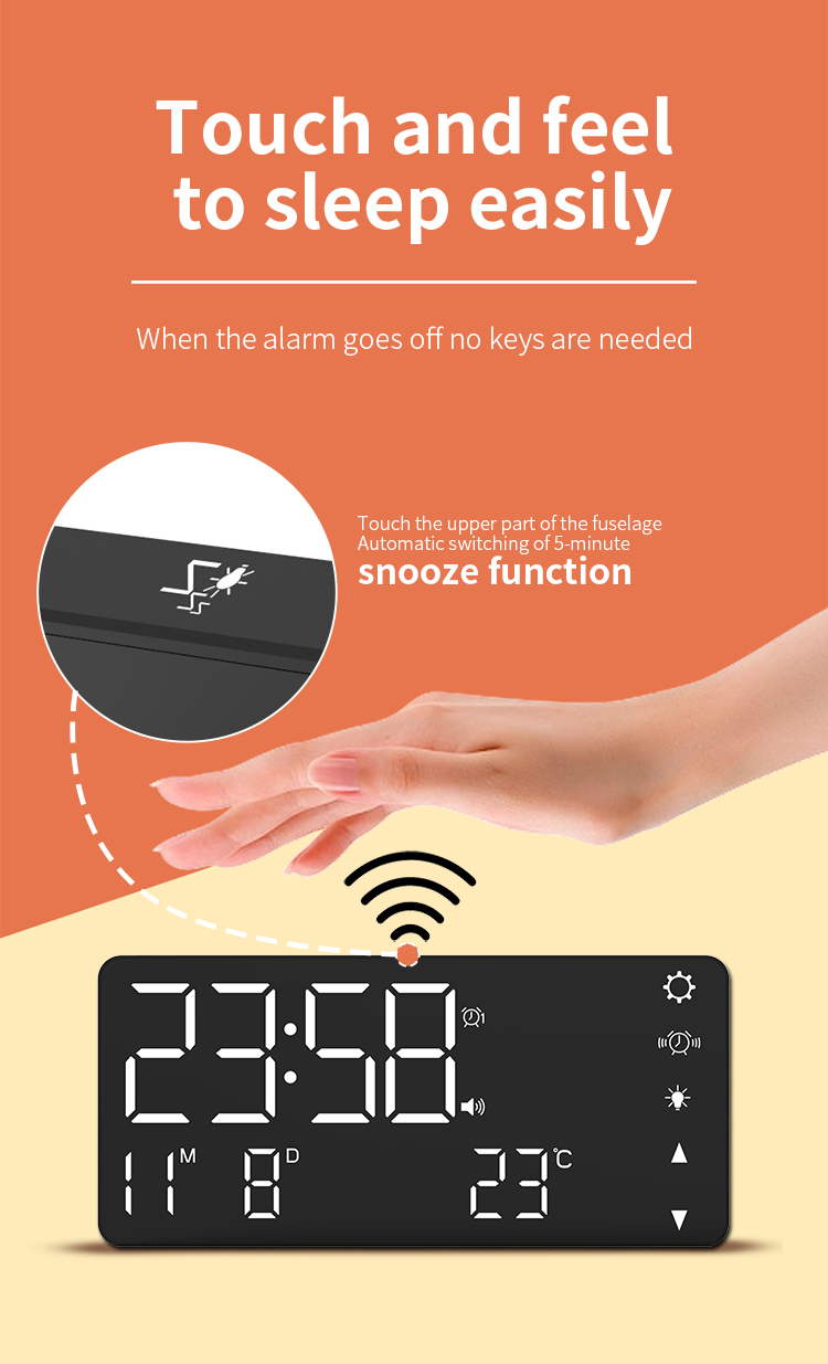 | 5 | Touch operation: adjust brightness/start snooze/turn off alarm/turn off display |