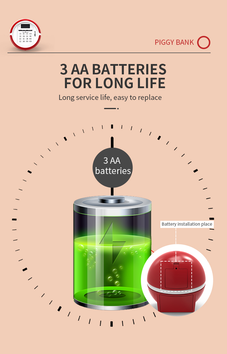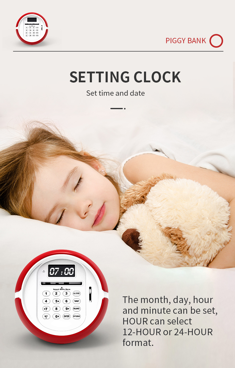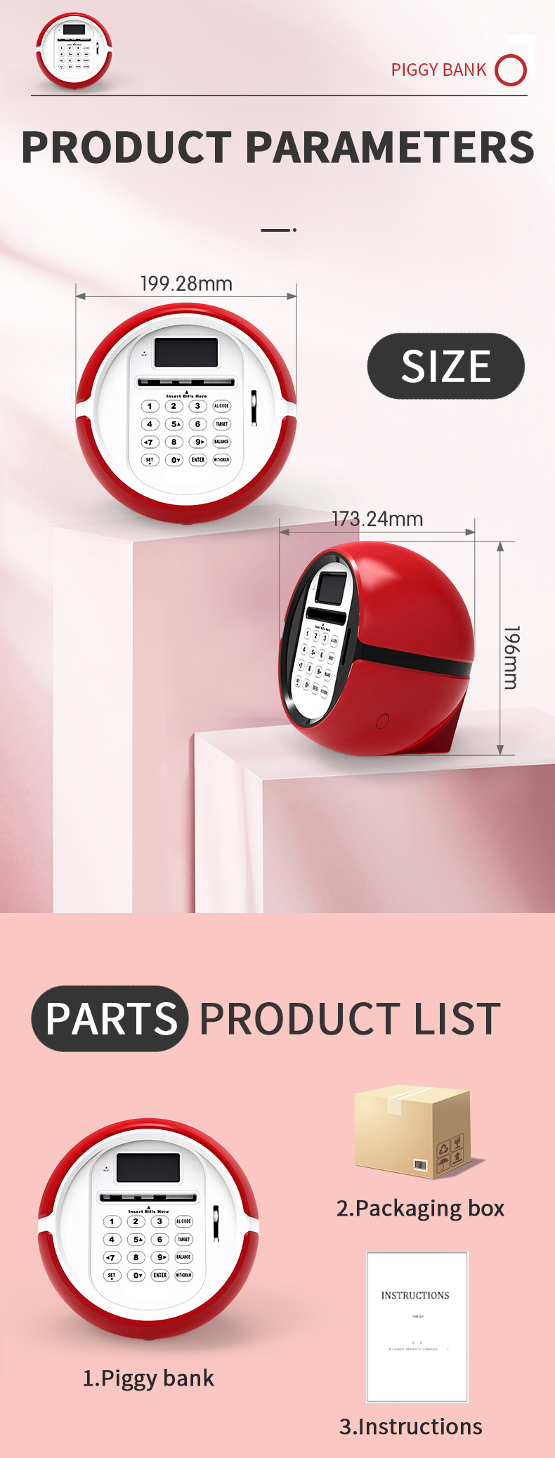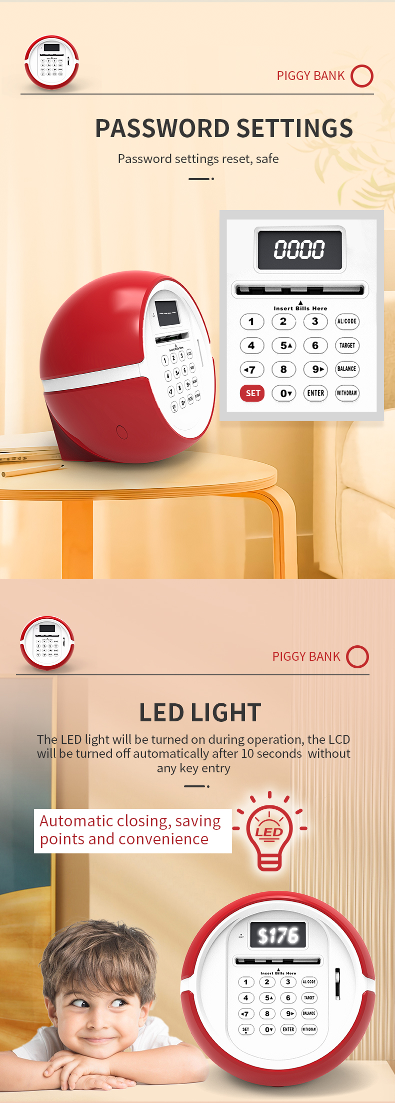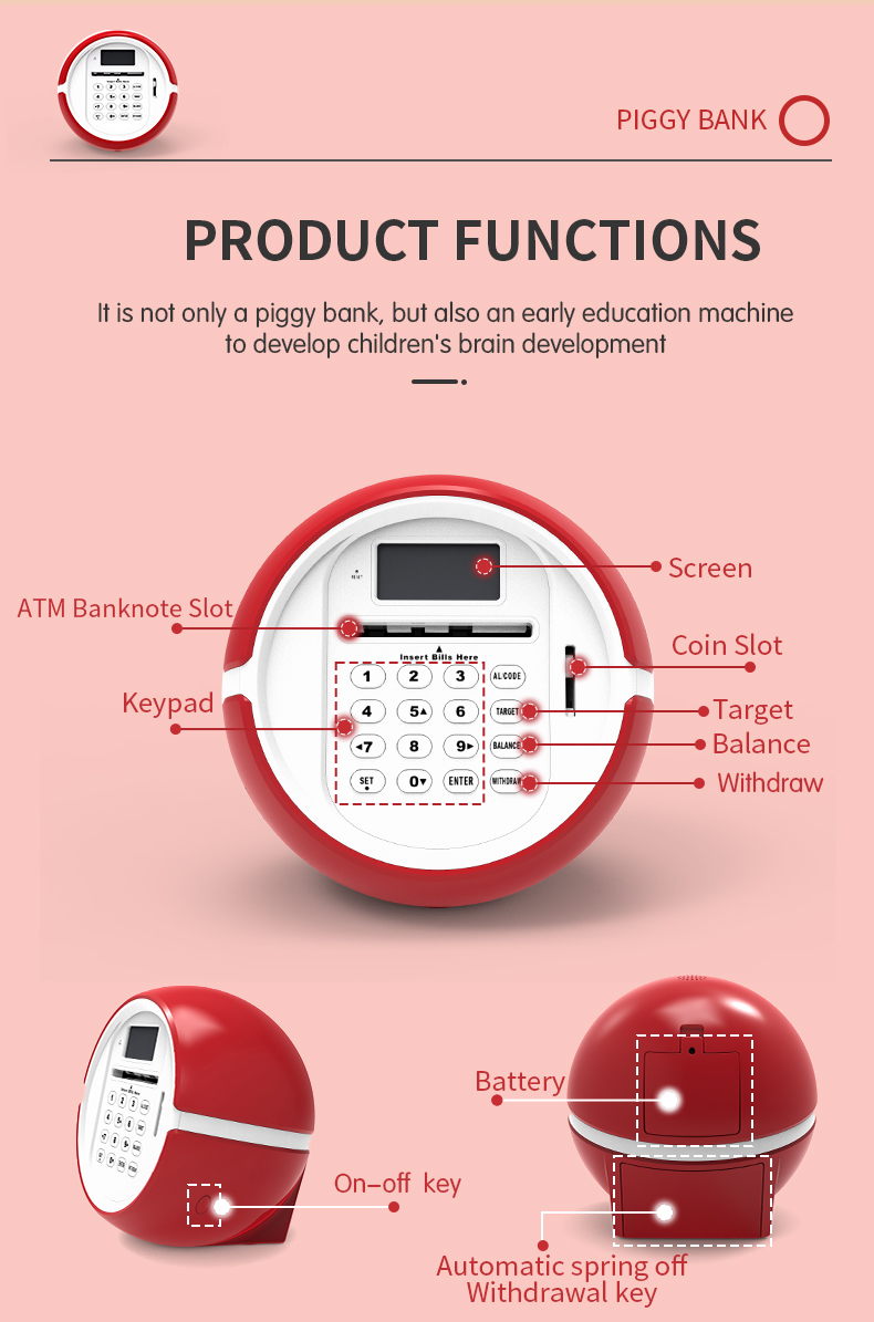 | 8 | Installing 3*AA battery/sound on or off/setting clock/setting alarm time/change code/coin deposit/banknote deposit/withdraw/check balance/set deposit target |