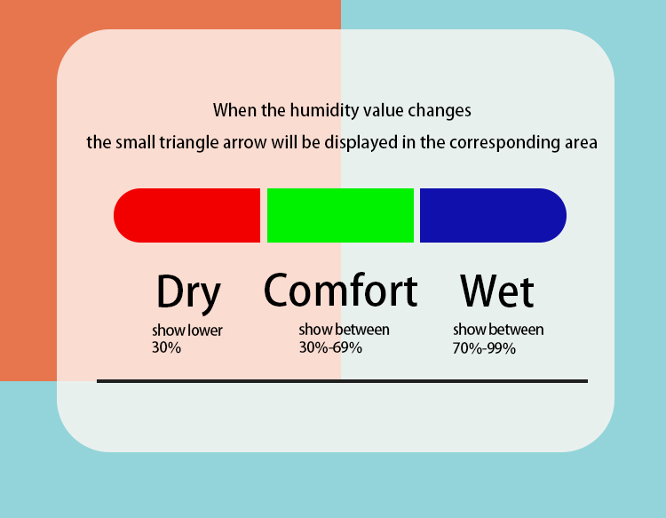 10 | Indicator arrow: dry humidity is below 30%,comfort humidity is between 30%-69%,wet humidity is above 70%-99% |